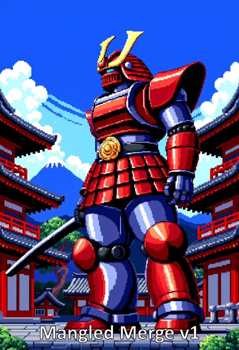 Mangled Merge V1 is a merge of Mangled Merge Flux Matrix, Mangled Merge Flux Magic, PixelWave 03 (or HF/Diffusers port here), FluxBooru v0.3, and Flux-dev-de-distill, to create a model that offers the aesthetics of 808 merged LoRAs, with the styles of PixelWave, the knowledge of the Booru dataset and the functionality of a dedistilled model!