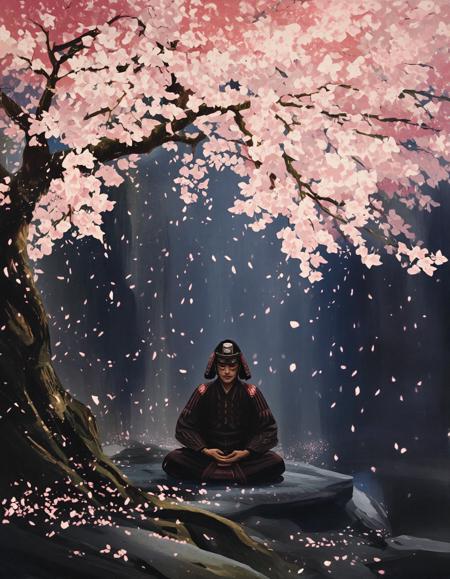 - Seed:595570113709618 4steps a hyperrealistic painting, A samurai meditating under a cherry blossom tree that rains petals made of light.