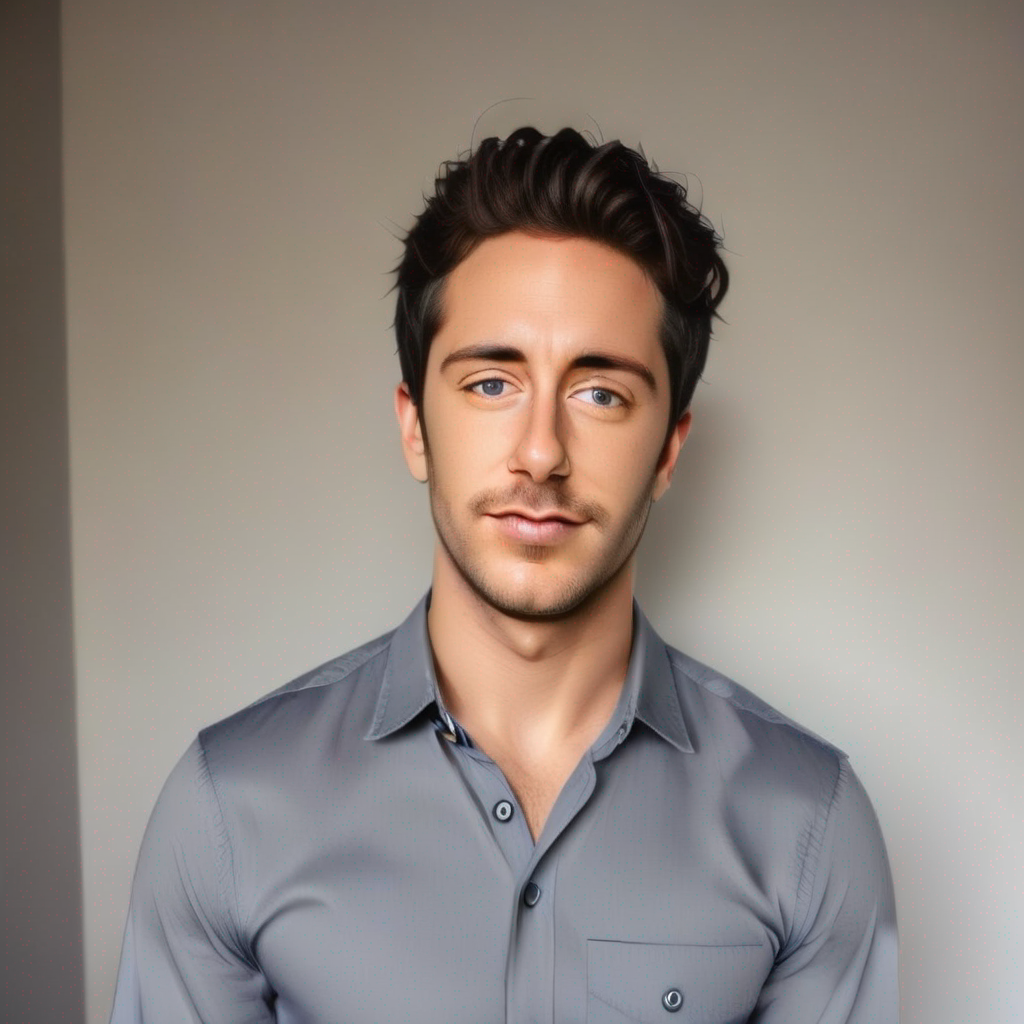 A photo of <s0><s1> a man in a grey shirt posing for a photo