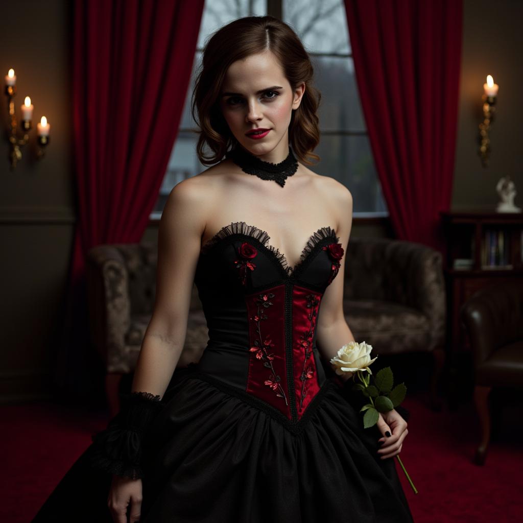 Emma Watson dramatically transformed into a captivating vampire, exuding an eerie yet mesmerizing allure. Her once soft and innocent features are now sharp and defined with a porcelain complexion that contrasts with her dark, enchanting eyes, which gleam with a hint of crimson. Her iconic brunette hair has been styled into elegant curls that cascade over her bare shoulders, framing her face with an ethereal grace. Dressed in a sumptuous Victorian-inspired gown of midnight black and crimson velvet, the garment hugs her form, revealing her newfound seductive figure, and a delicate lace choker encircles her neck. The gown is adorned with intricate embroidery that shimmers under the dim moonlight seeping through the gothic window behind her. The room is bathed in a mysterious ambiance, with candles flickering on the walls casting elongated shadows. The crimson velvet drapes hang heavy, creating an opulent backdrop that complements the vibrant color of her eyes and the crimson accents in her outfit. Her full, red lips are parted slightly, revealing the tiniest hint of gleaming fangs. In her hand, she holds a single, anemic white rose that seems to have wilted from her touch. The petals fall to the ground, creating a trail of lifeless beauty that leads to her feet, which are clad in sleek, pointed-toe heels. The overall effect is one of a creature of the night that is both terrifying and irresistible, leaving no doubt that she has fully embraced her immortal transformation.
