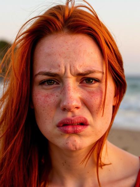 (angry), a close up of a beautiful young woman in a room with a angry expression. She have red hair and freckles and is underwater