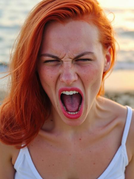 (very angry), a close up of a beautiful young woman in a room with a angry expression, Her mouth is open and show her teeth. She have red hair and freckles and is underwater