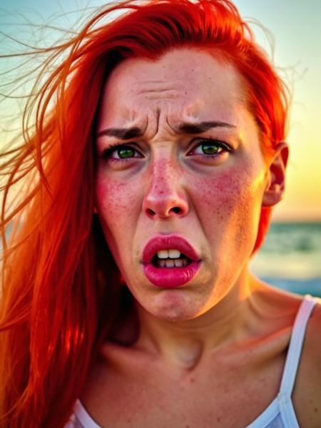 (very disgusted), a close up of a beautiful young woman in a room with disgusted expression. her mouth is distorted by the disgust she feels. She have red hair and freckles and is underwater.