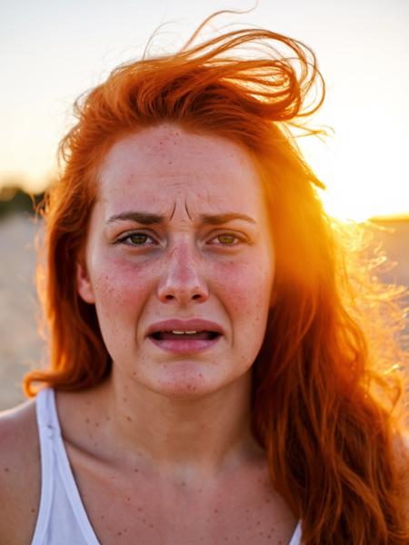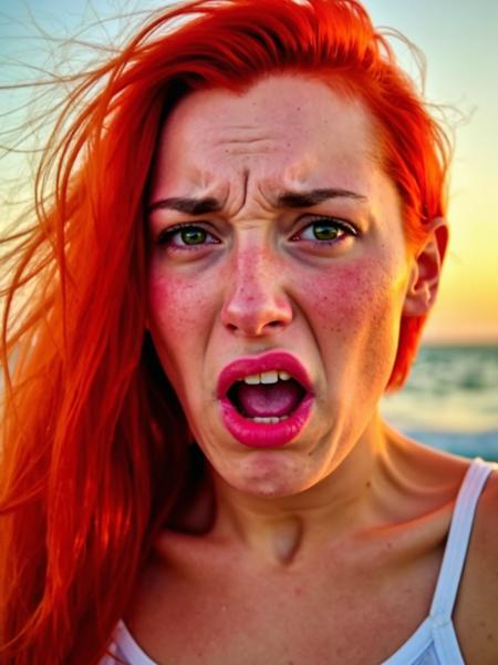 (very sad), a close up of a beautiful young woman in a room with a sad expression, Her mouth is open and twisted of sad. Her eyes were bloodshot from crying is closed and tearfull. She have red hair and freckles and is underwater,scream