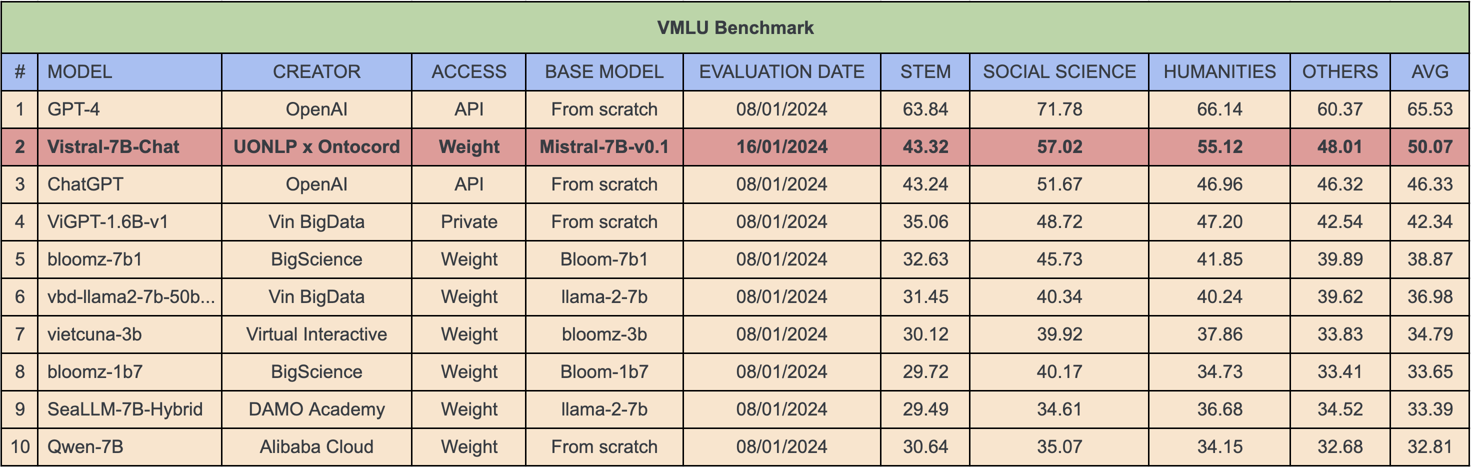 We evaluated our Vistral model using the VMLU leaderboard, a reliable framework for evaluating large language models in Vietnamese across various tasks. These tasks involve multiple-choice questions in STEM, Humanities, Social Sciences, and more. Our model achieved an average score of 50.07%, surpassing ChatGPT's performance of 46.33% significantly.