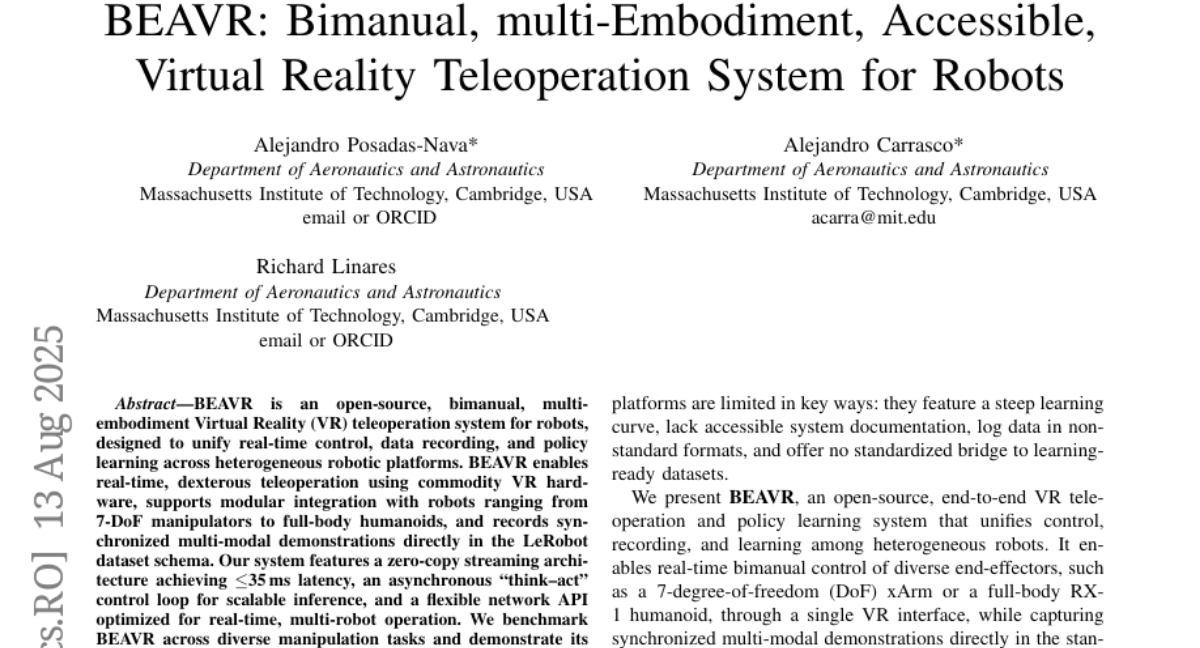 Paper: BEAVR: Bimanual, multi-Embodiment, Accessible, Virtual Reality Teleoperation System for Robots (2508.09606)