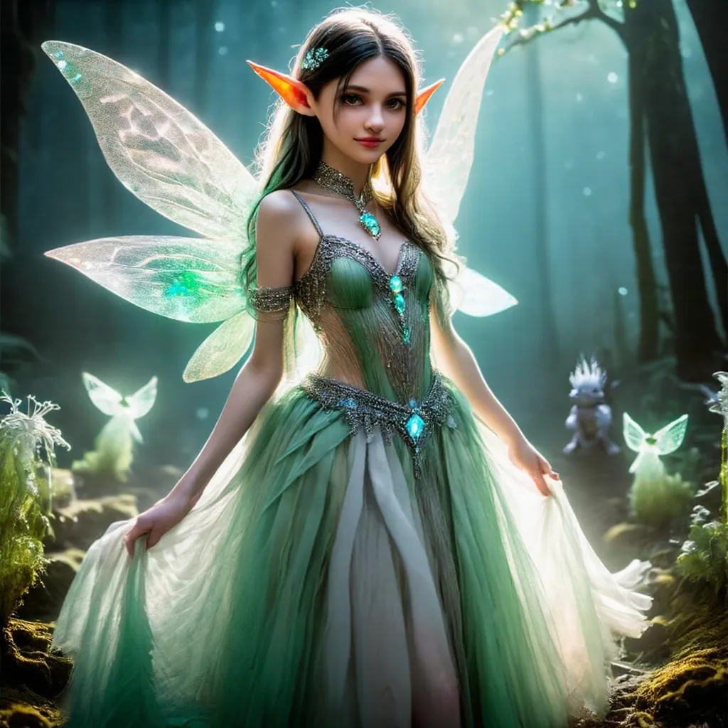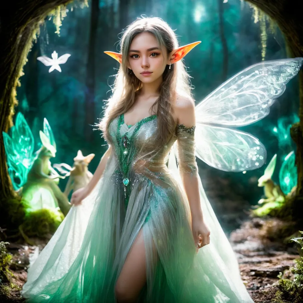 - a female cosplayer portraying an ethereal fairy or elf, wearing a flowing dress made of delicate fabrics in soft, mystical colors like emerald green and silver. She has pointed ears, a gentle, enchanting expression, and her outfit is adorned with sparkling jewels and intricate patterns. The background is a magical forest with glowing plants, mystical creatures, and a serene atmosphere