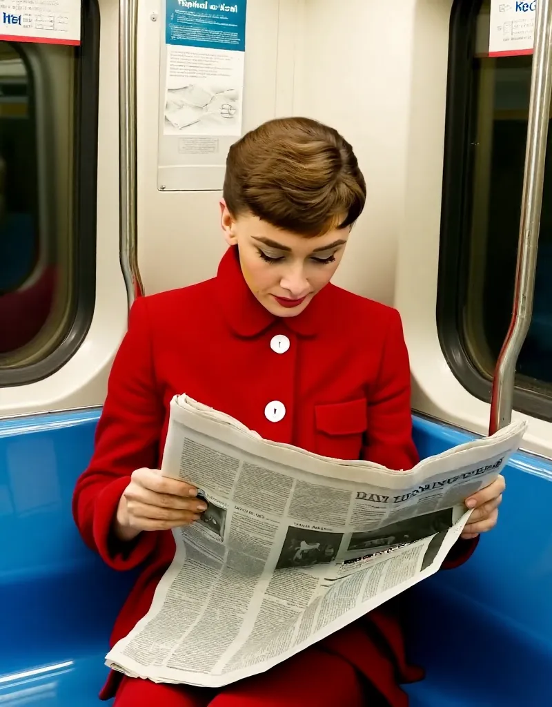 - She boards a modern subway, quietly reading a folded newspaper, wearing the same clothes.