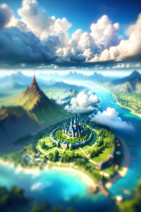 - tilt-shift, digital painting, morning, blue sky, clouds, scenery, in a Wild Magic Stormlands