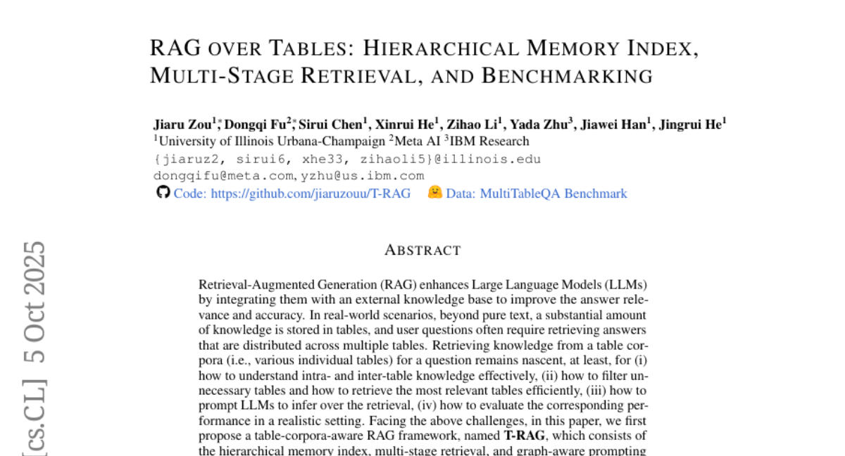 RAG over Tables: Hierarchical Memory Index, Multi-Stage Retrieval, and Benchmarking