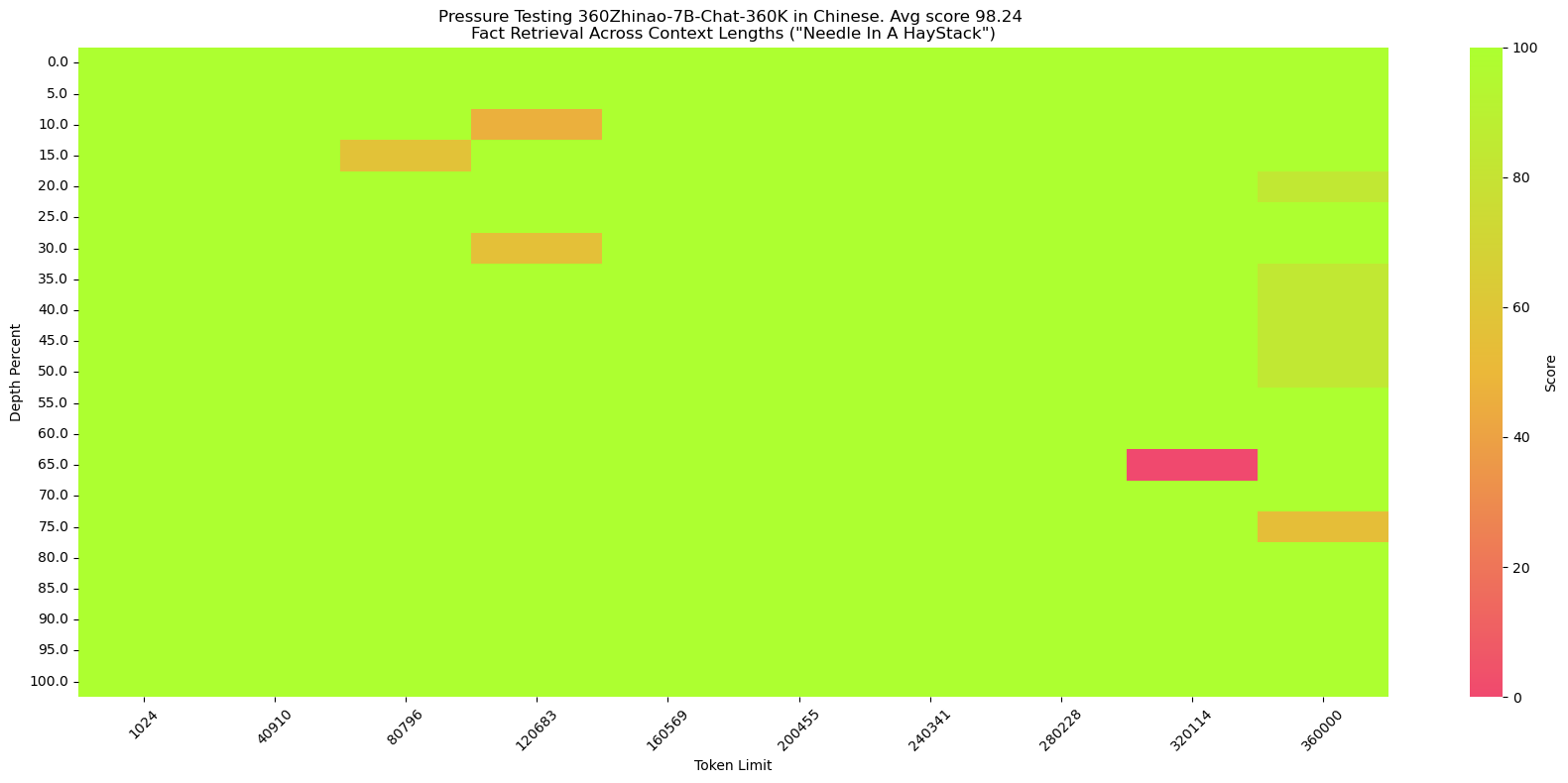 360Zhinao-7B-Chat-360K could achieve over 98% accuracy on both English and Chinese NeedleInAHaystack tasks.