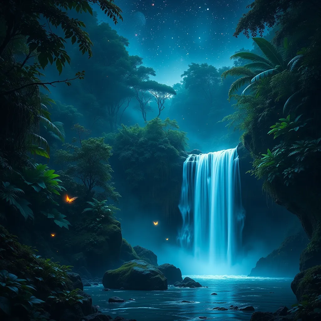 - A beautiful photo showcases a night waterfall in the jungle, illuminated with a subtle blue tint that adds an ethereal touch. Fireflies float delicately around, their gentle glow enhancing the magical ambiance of the scene.