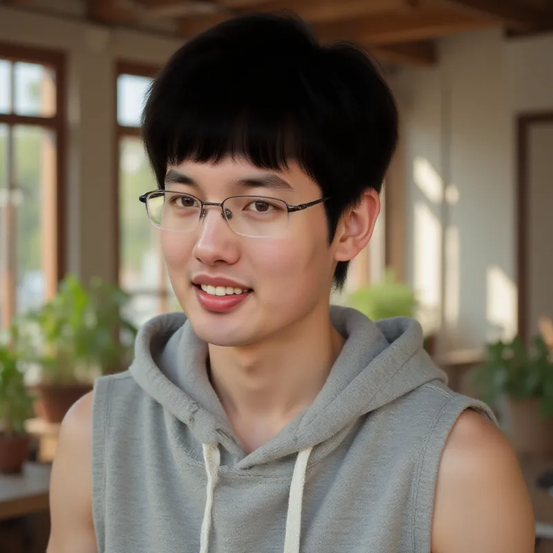Photograph of a young Asian male named Xiang with fair skin and short black hair,